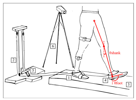 Schematic of the experimental setup. Labeled components are as follows: 1. perturbed foot; 2. spring-rope mechanism; 3. treadmill; 4. footswitch under the unperturbed foot; 5. cam-based braking mechanism; 6. camera-based motion capture system. As a representative example, the position of the Inertial Measurement Units (IMUs) is reported on the thigh, shank and foot of the right limb, and the elevation angles used as input of the algorithm (i.e., elevation angles of the shank and foot—θshank and θfoot, respectively) are depicted on the left limb.