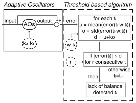 Our PIDA was designed to signal sudden modifications of the quasi-periodic features of walking patterns due to unexpected perturbations [25]. To achieve this task, it accounted for two main components (Figure 2): (1) a set of adaptive oscillators (AOs) coupled with a kernel based non-linear filter, and (2) an adaptive threshold-based algorithm (ATBA).