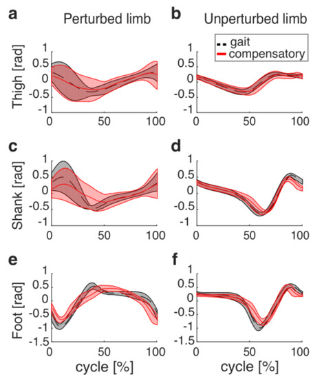 Elevation angles of the thigh, shank and foot recorded before (dashed black lines) and after (red lines) the perturbation onset. x-axes represent the time course (in %) of the gait and compensatory cycles; 0 and 100% correspond to two consecutive heel strikes of the left foot. Mean (bold) and one standard deviation (shaded areas) are shown for both the perturbed ((a), (c) and (e)) and unperturbed limb ((b), (d) and (f)) segments.