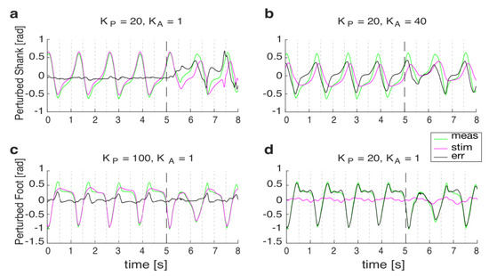 As shown in Figure 5, the behavior of the AOs, while tracking the shank orientation, was acceptable (RMSD < 0.1 rad, and ρ < 0.9) in a wider subdomain of learning gains (i.e., kA and kP; Figure 5a,b) compared to that allowing for an accurate foot tracking (Figure 5c,d).