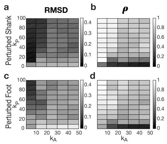 RMSD ((a) and (c)) and ρ ((b) and (d)) for each learning gain of the AOs (i.e., kA and kP) and for both input signals (i.e., elevation angles of perturbed shank and foot). x-axes show kA; y-axes show kP. Dark and light gray describe low and high values, respectively.