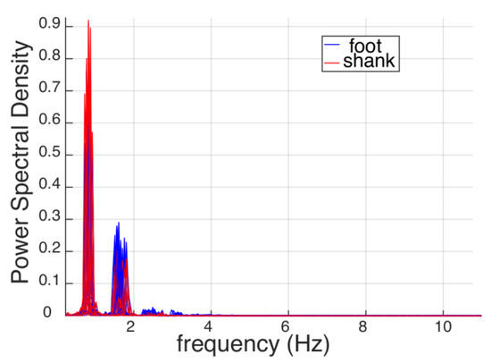 Power spectral density of the elevation angles of the perturbed foot (blue lines) and perturbed shank (red lines). Signals of each subject and each trial are superimposed.
