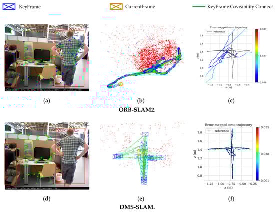 DMS-SLAM and ORB-SLAM2 use an RGB-D camera to locate and map on fr3_walking_xyz. (a,d) The image frame on fr3_walking_xyz. The red boxes represent moving objects. Green dots represent the ORB feature points corresponding to 3D points in the local map, while blue dots represent them only observed by the current frame. (b,e) The actual running trajectory that the camera takes during the move. The red represents the local map points which are observed in the current frame. The red and blue represent the local map points and are constructed during the tracking process. (c,f) The positioning deviation of the camera in the course of motion is obtained, which is based on the ground truth as the benchmark. Where “reference” represents the ground truth. The color represents the error value of the tracking trajectory and ground truth.