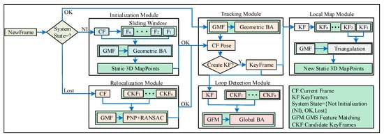 We use the sliding window to achieve GMS feature matching of two frames of images, and obtain a relatively static initialization 3D map, as is shown in the initialization module in Figure 2. Since the positional transformation of moving objects in the image is not obvious in successive image frames, we create a sliding window to achieve feature matching between multiple image frames. We save n image frames in the sliding window (n = 7, which is experimentally determined). When the new image frame is established, it enters the initialization module if the system is not initialized. The current image frame and the first image frame (F1 in Figure 2) in the sliding window are matched by the GMS algorithm. In this way, the influence of moving objects in the scene is eliminated, and feature matching of the static region is obtained.