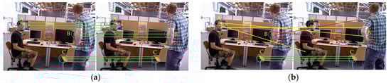 Two consecutive image frames are shown in Figure 3a. Since there is no dynamic object in the region C, the scores of the feature matching point pairs in the region are higher. However, the dynamic objects in the regions A and B do not significantly move between successive image frames, so there are still many feature matching point pairs in these area, and a larger S value is also obtained. Assume that the scores of the feature matching point pairs in the A, B, and C regions are , , and respectively; there is Formula (2):
