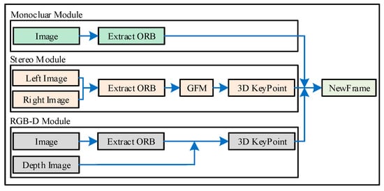 For monocular and RGB-D cameras, image frames are built in the same way as ORB-SLAM2. For stereo cameras, after extracting the uniform distribution of ORB features, the Grid-based Motion Statistics algorithm is used to match the ORB features of the left and right images. Then the parallax of the left and right matching points and is calculated. The depth value of the matching feature points in the left image under the left camera coordinate system is obtained according to the Formula (6):