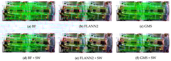 SW represents the sliding window, and the red box/ellipse indicates that the object in the area has moved. (a–c) Three matching algorithms use two consecutive frames of images to achieve feature matching on the fr3_walking_xyz dataset in TUM. (d–f) These algorithms combine the sliding window model to perform feature matching between the first frame image and the nth frame image. GMS with SW can get the best feature matching result and eliminate the influence of moving objects in the red area.