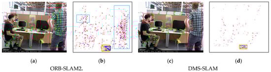 (a,c) System initialization results of ORB-SLAM2 and DMS-SLAM on the fr3_walking_xyz dataset of TUM, and the red boxes indicate the area that is moving. (b,d) The local map is built after system initialization, and the blue boxes represent the dynamic 3D points in the local map.