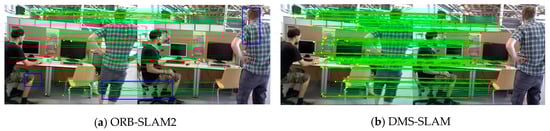 (a,b) Feature matching results between keyframes in ORB-SLAM2 and DMS-SLAM. The blue boxes in the figure indicate the dynamic area or the wrong feature matching point pairs.