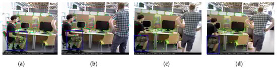 The order is (a), (b), (c), (d). They indicate the tracking process of our system. Where the blue box indicates that the area changes from static to motion, deletes the map point corresponding to the region’s feature point.
