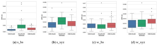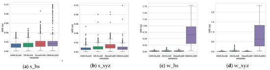 Similarly, we use the evo tool to achieve APE and motion trajectory plotting for monocular vision SLAM systems in low dynamic (s_*) and high dynamic (w_*) scenes. Figure 12 shows the distribution range of APE on the four datasets of s_hs, s_xyz, w_hs and w_xyz for the three SLAM systems. From the figure, our system gets the best accuracy. Figure 13 shows the ATE of the DMS keyframes during tracking, and our system can achieve stable pose tracking in low dynamic and high dynamic scenes.