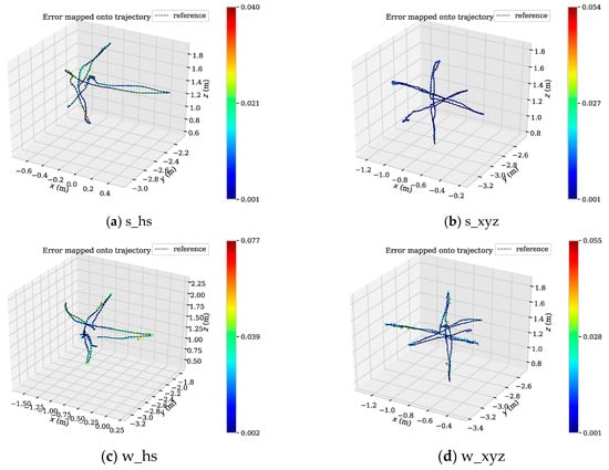 To further illustrate the positioning accuracy of the system, we use the evo (https://github.com/MichaelGrupp/evo) tool to draw the absolute pose error (APE) and the motion trajectory. Figure 10 shows the positioning error of several visual SLAM systems during the tracking process on the four datasets s_hs, s_xyz, w_hs and w_xyz.