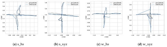 As can be seen from Figure 16, our system’s accuracy in these sequences is significantly better than the original ORB-SLAM2 system. Figure 17 is the tracking trajectory obtained in the same sequence and the DMS-SLAM is consistent with the ground truth during the whole tracking and has high accuracy.