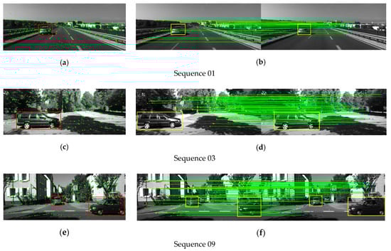 The KITTI dataset is composed of urban and highway images. It gets the characteristics of long distance, variable environment and dynamic objects. For visual SLAM, there are enormous challenges. In the previous experimental analysis, we used the combination of the sliding window and GMS to achieve feature matching between two image frames in the TUM datasets. To ensure the integrity of the experiments in the article, we also implement the experiments of feature matching and pose tracking in the KITTI datasets. Since we have explained the necessity of combining sliding windows with GMS algorithms, therefore, the results of the feature matching experiments are directly obtained according to our algorithm, and are no longer compared with other algorithms. Figure 14 shows the feature extraction and matching results of the 01, 03, 09 sequences in the KITTI datasets.