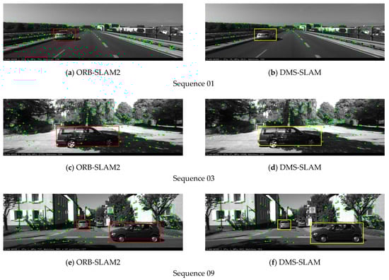 The pose tracking experiments of ORB-SLAM2 and DMS-SLAM on the 01, 03, 09 sequences in the KITTI dataset. The rectangular box represents the moving object in the scene, and the others are static areas.