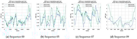 We also use the evo tool to plot the APE and trajectory of the 00, 05, 07, 09 sequences in the KITTI dataset (Figure 16 and Figure 17). Since DynaSLAM is a non-real-time SLAM system, we no longer draw its APE and use only the data from the original paper for comparative analysis. Figure 16 shows the APE distribution of the DMS-SLAM and ORB-SLAM2 systems throughout the tracking.