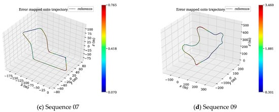 (a–d) Motion trajectory of DMS-SLAM on the 00, 05, 07, 09 sequences in the KITTI dataset. Where x and z represents the horizontal direction, and y represents the vertical horizontal direction.