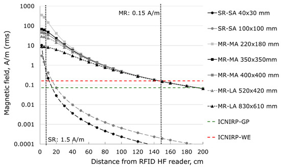 International standards provide characteristics of the reading ranges and emitted EMF of various RFID HF technologies using passive TAGs (i.e., TAGs that are useful even over many years, much longer than in the case of active TAGs, whose operation depends on the life of batteries). The mentioned reading range is linked to the strength of the magnetic field emitted from the reader, which has to be able to successfully charge (energize) a TAG and to allow wireless contact between the reader and the TAG. The small antenna, short-range (SR–SA) readers used with proximity cards require a magnetic field exceeding 1.5 A/m affecting a TAG located at a distance from the reader equal to the reading range—up to several centimeters (ISO/IEC 14443-2:2016 standard) [8]. The medium-range readers, usually equipped with a medium or large antenna (MR–MA or MR–LA, respectively) require a field of 0.15 A/m at a distance equal to the reading range—up to 1.5 m in that case (ISO/IEC 15693-1:2010 standard) [9].