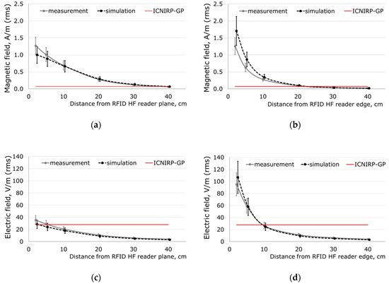 The numerical model of the EMF source was validated by measurements of the electric and magnetic field distribution in the vicinity of the single RFID HF reader with a reading range of 30 cm. At a distance next to an RFID HF reader, where the EMF distribution is highly heterogeneous and the level of exposure may exceed exposure limits (Figure 1) and where the considered head of an implant user was located, EMFs were characterized by the results of measurements. Figure 3a,b shows magnetic field distribution along the axis perpendicular to the reader plane (magnetic field along this axis determines the reading range) and along the axis perpendicular to the reader edge (on the side of the reader), respectively. Similarly Figure 3c,d shows electric field distribution. Measurement results were obtained by the volume measurement probe (spatially averaging measured EMF) and simulations by “virtual volume probe”, the central point of both probes were located at particular distances of 10, 20, 30, and 40 cm. The electric and magnetic field at distances of 2 cm and 5 cm were extrapolated from the results of measurements performed in longer distances (measurements of several cm away from the reader were not possible because of measurement probe’s volume of several centimeters). The whiskers on Figure 3 show the estimated uncertainty of measurements: ±20%, (K = 1) and numerical simulations: ±25% (K = 1). The obtained results were compliant within an uncertainty of measurements and numerical simulations (Figure 3a–d). A correlation analysis showed statistically significant strong correlations between EMF distribution in the vicinity of the RFID HF reader obtained by measurements and simulations:
