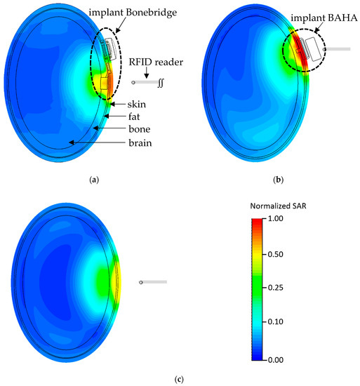 The distribution of localized SAR (at frontal cross-section through the center of the implant part fixed to the bones of the skull) simulated by CST Studio Suite, under exposure to EMF from an RFID HF reader (13.56 MHz) in exposure scenario c, as shown in Figure 2: (a) near a Bonebridge implant, (b) near a BAHA implant and (c) in a non-user (unified normalized logarithmic color scale of absolute SAR values—reference value: maximum localized SAR value calculated for exposure scenario c and BAHA implant user).