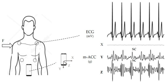 Theelectrodes and a smartphone were positioned on the subject: the electrocardiogram (ECG) signals were acquired simultaneously and synchronized by a motion artifact caused by an impulsive force (F) impressed on the subject’s shoulder. The ECG and the simultaneously acquired mobile phone tri-axial accelerometric signals (m-ACC) are shown: While the lateral (X) component does not project any heartbeat vibration, the longitudinal (Y) and normal (Z) components show a clear periodic complex (SC) related to cardiac heartbeat activity.