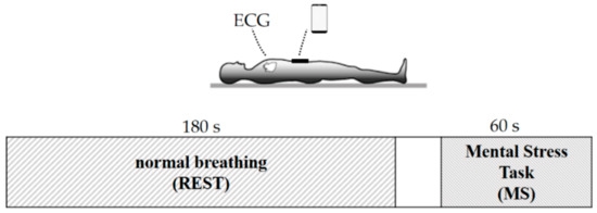 The signals were synchronized by applying a lateral impulsive force stimulus applied on to the subject’s shoulder, which was detected both by the smartphone’s accelerometers and by the ECG electrodes (as a movement artifact). After a 10 min acclimation period in supine posture, the experimental protocol included two acquisitions performed sequentially (see Figure 2): The former, lasting 3 minutes with the subject breathing normally in resting conditions (REST) and, after 1 minute of readjustment, the latter lasting 1 minute with a mental stress (MS) condition. As mental arithmetic is one of the most commonly utilized laboratory psychological stressors able to increase heart rate (HR) [25,26,27], stress was provoked as follows: The subject was instructed before the beginning of the experiment on how this phase would have been performed: Given a starting 4-digit number told to the subject at the beginning of the mental stress acquisition, the subject had to perform silently arithmetic serial subtractions of seven from that number at a pace of one every ten seconds, and communicate the final result only at the end of the 1-min acquisition. Preventing subjects speaking during the acquisition was a design choice, as communication between the subject and the researchers would have hindered the signal quality, as the acquired signal is sensitive to vibrations that are generated by speaking.