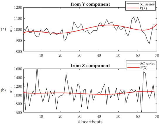 Polynomial interpolation series P(X) (in red) over imposed to the corresponding systolic complex beat-by-beat duration series (SCs; in black), separately for Y (a) and Z (b) acceleration components. See text for more details.