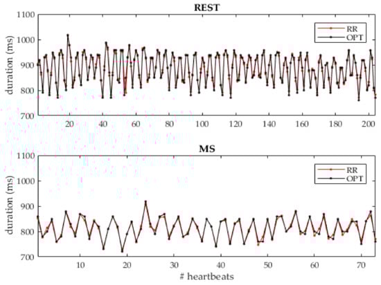 In Figure 5, an example of the RR and OPT beat-to-beat variability series derived from a representative subject at REST and during MS are shown superimposed: It is possible to appreciate in both conditions the correspondence of the measured heart cycle durations.