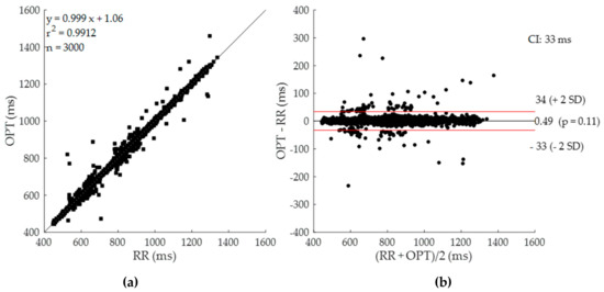 In Figure 6, the result of linear correlation and Bland-Altman analyses by comparing the gold standard RR versus the corresponding beat-by-beat OPT series are presented. It is possible to appreciate the high r2 value (0.99) and the narrow confidence interval (CI = ±33 ms, ±2 SD) achieved by the proposed method, tested globally in a range of heartbeat duration from 447 ms up to 1337 ms.