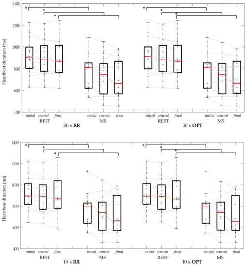 Heart beat duration (ms) obtained from the ECG (RR) and the optimal (OPT) series by the smartphone’s accelerometer expressed as a median (25th–75th percentiles), for 60 s, 30 s, and 10 s duration and different segments (initial, central, final), in control (REST) and mental stress (MS) conditions. *: p < 0.05 REST vs. MS (Wilcoxon test).