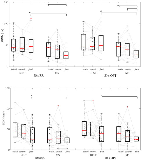 Standard deviation of normal-to-normal interval (SDNN) distributions and individual data of RR and OPT series, in control (REST) and mental stress (MS) conditions, using 30 s (upper panel) and 10 s (bottom panel) signal segments considered at the initial, central, and final series portion. *: p < 0.05 REST vs. MS (Wilcoxon test); †: p < 0.016 among segment positions (Friedman test and Bonferroni correction).