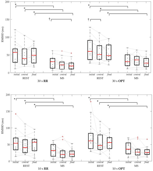 Root mean square of successive differences (RMSSD) distributions and individual data of RR and OPT series, in control (REST) and mental stress (MS) conditions, using 30 s (upper panel) and 10 s (bottom panel) signal segments considered at initial, central, and final series portion. *: p < 0.05 REST vs. MS (Wilcoxon test); †: p < 0.016 vs. initial portion (Friedman test and Bonferroni correction).