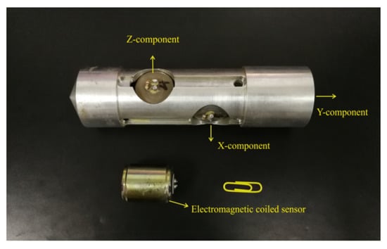 The tri-component electromagnetic coiled sensors. The natural frequency and sensitivity of the sensor were 60 Hz and 0.6 V/(m/s), respectively.
