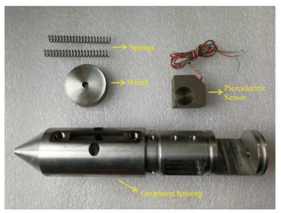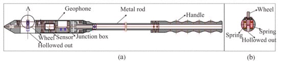 To ensure high-quality seismic data acquisition, a 2-m-deep hole was firstly drilled for geophone installation. Afterward, we applied the new semi-automatic coupling geophone which consisted of three parts: a geophone, a metal rod, and a handle (Figure 3). The geophone used a piezoelectric sensor, a wheel, and a junction box (Figure 3a). The wheel was designed and attached for the purpose of coupling; more specifically, the center of the wheel was attached with two hard springs so that the wheels could rotate and move in a vertical manner (Figure 3b and Figure 4). Once the device was pushed into the borehole, the wheel could start to roll along the surface of the sidewall of the borehole, aiding the installation of the geophone tremendously (Figure 5). In a nutshell, this method guaranteed a fair coupling and easy removal. After the device was pushed into the borehole, a wedge-shaped stone block was applied to clamp the handle to reduce vibration. Afterward, the hole was sealed with clay to reduce acoustic waves. Nevertheless, new issues with this approach could arise; rock slag could start to accumulate and sink into the cavity below the wheel, thereby blocking the wheel. To confront with this problem, a sleeve under the wheel was designed to remove the accumulating rock slag. After each use, the rock slag could be discharged from the cavities by washing.