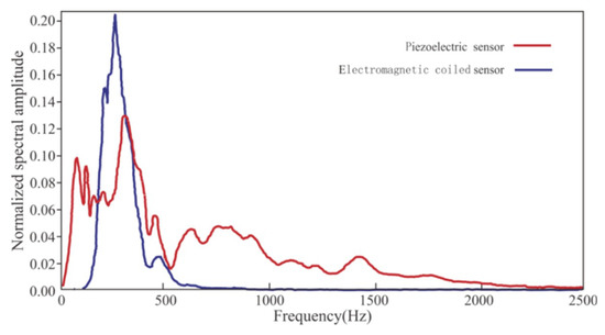 Spectral analysis of data acquired by the piezoelectric sensor and the electromagnetic coiled sensor: (a) piezoelectric sensor; (b) electromagnetic coiled sensor.