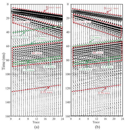 The forward modeling data are shown in Figure 15. Firstly, the direct wave and the Rayleigh wave could be directly found. The Rayleigh wave was generated in the tunnel wall and had evident dispersion characteristics. Since the direct wave and the Rayleigh wave propagated directly from the source to the geophone without any reflection, the energy was strong. It can be seen that the face P-wave reflected by the tunnel face, as well as the Rayleigh wave, partially coincided with the X-component data (Figure 15a). A face P-wave in the Y-component could not be found because of the weaker energy due to the P-wave’s polarization (Figure 15b). In theory, there should be a face PS (P-to-S) wave reflected by the tunnel face followed by the face P-wave [26]; however, the size of the face was too small, and the energy of the face PS wave was too weak to be found. The IP-wave (P wave reflected by interface I) could be found under the face P-wave. The IP-wave is an important wave for tunnel seismic detection. We can image interface I by jointly processing the IP-wave and the IPS wave (P-to-S wave reflected by interface I). Rayleigh waves arriving at the tunnel face were converted into a high-amplitude RS (Rayleigh-to-S) wave followed by an IP-wave [27]. The energy of the RS wave was too strong and completely coincided with the IPS wave and the IIP-wave (P wave reflected by interface II), causing the IPS wave and the IIP-waveto be unrecognizable; therefore, we marked their positions according to the wave travel time. Both of these waves are critical for imaging. Another important wave at the bottom of the time axis is the IIPS (P-to-S wave reflected by interface II) wave, which is the converted S-wave of interface II. Since the direct wave and the Rayleigh wave were too strong, the IIPS wave energy here was relatively weak and difficult to recognize, and the Y-component (Figure 15b) data were slightly more obvious than the X-component data (Figure 15a) due to the polarization direction. In order to study the reflected wave in front of the tunnel working face, there was no design reflection interface behind the tunnel face in the model. It is reasonable to speculate that there were still a large number of reflected waves from the geologic body behind the tunnel face in the actual tunnel seismic method. By analyzing the forward data, an evident law was discovered. The transmitted wave (including the direct wave and the Rayleigh wave) was tilted to the lower right, and the reflected wave was inclined to the upper right. The reflected waves that were tilted to the upper right needed to be extracted, and these reflected waves were used to image the geology in front of the tunnel face. Previous forward modeling mainly focused on the shape of the geological body in the front of the tunnel face, without considering the tunnel boundary [10,43]. This study found that the tunnel wall and the face of the face generate strong-amplitude surface waves and RS waves, which must be carefully filtered to obtain the reflected waves in the tunnel’s advanced direction.