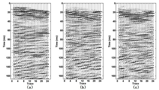 Seismic data acquired by the conventional geophone. (a–c) are the X-component, the Y-component, and the Z-component data, respectively.