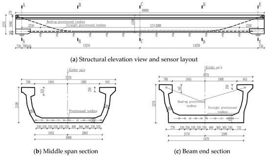 Structural configuration and sensor layout. (a) Structural elevation view and sensor layout; (b) Middle span section; (c) Beam end section.