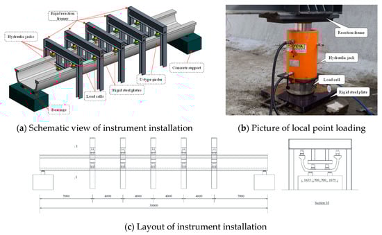 Schematic view of vertical loading test setup. (a) Schematic view of instrument installation; (b) Picture of local point loading; (c) Layout of instrument installation.