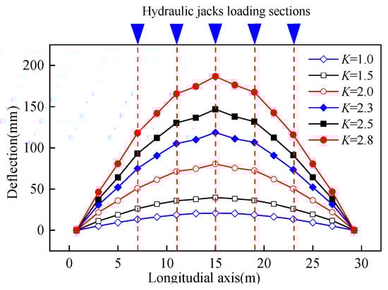 Figure 6 also gives the longitudinal deflection distribution of the girder. The girder deformed symmetrically along the longitudinal direction under each level of the vertical loads, which was consistent with the deformation characteristics of simply supported beams under vertical symmetric loads. Before the load coefficient reached 1.5, the deflection of girder exhibited as smooth and consistent curves over the whole length of girder, it implied that the girder was in linear deformation stage. While as the load continued to increase and the load coefficient K was larger than 1.5, local excessive deformation occurred at the key sections where the hydraulic jack loaded, and the overall deflection curves exhibited obvious turning points. Local deformation became even more significant as the load level ascended.