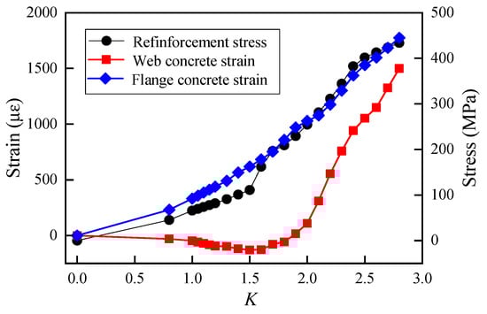 Figure 7 shows the measured values of concrete strain and reinforcement stress under each level of the vertical load. It is worth noting that the longitudinal stress of bottom slab reinforcement increased linearly within the range of K from 0.38 to 1.5, which demonstrated that the steel rebar was tensioned elastically. Whereas as the load coefficient K increased from 1.5 to 2.8, the load-stress curve went into nonlinear elastic-plastic stage. For the longitudinal strain of concrete web at half height of the U girder, the value remained relative low (even negative) when the load coefficient was less than 1.8. The longitudinal strain turned to positive (tensile strain) and continued to increase to 1761 με at K = 2.8. The flange was always under compression state during test loading. The negative compressive strain of flange was inversed sign and expressed as positive values in Figure 8 for the sake of simplified presentation. It is clear that the strain of flange concrete increased with the vertical load linearly, and its maximum compressive stress was about 62.5 MPa according to the uniaxial Hooke’s law, which is close to the tested concrete compressive strength in Table 1.