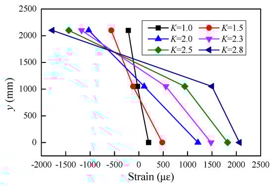 In order to compare the longitudinal strain distribution along the height of the girder section at mid-span, the reinforcement stress was converted to its longitudinal strain. The abscissa is the longitudinal strain, and the ordinate is the height from the measuring point to the bottom of the section. It can be observed that the longitudinal strain varied linearly along the full height of the beam section as the load coefficient was less than 2, which demonstrated that the deformation behavior of U-shaped girder agreed well with the plane-section assumption. From these characteristics of strain distribution, conclusions can be obtained that the concrete and reinforcement bonded perfectly before the load coefficient was less than 2.0. As the vertical load increased, the concrete of bottom slab started to crack and the slip might occur between the concrete and rebar, which demonstrated the girder entered elastic-plastic deformation stage, the distribution of the sectional strain did not follow the plane-section assumption.