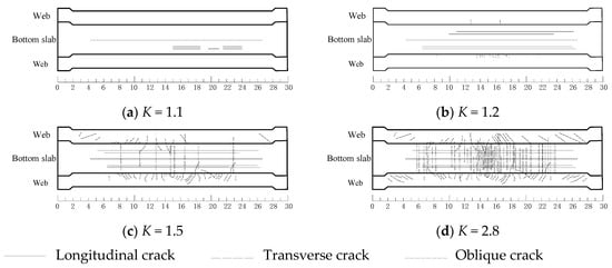 The crack development process as the load increased is shown in Figure 9. No visible crack appeared at the surface of the girder until the load coefficient K reached 1.1. The bottom slab bended transversely under the local action of vertical load, several longitudinal cracks emerged and developed at the outer side of bottom slab as the load increased. When the load coefficient equaled to 1.2, some tiny transverse cracks added on the outer side of webs. With the increasing load, transverse cracks started to appear on the outer side of bottom slab and continued to extend towards the web which presented as “U”-shape crack. As the load coefficient increased to 1.5, Shear induced oblique cracks appeared on the concrete web which developed gradually. During the subsequent loading process to the ultimate bearing capacity stage of girder, more cracks emerged on the outer and inner surfaces of the webs and bottom slab of girder. The longitudinal and transverse cracks on the bottom slab gradually developed and passed through. The width and length of oblique cracks on the web continued to grow significantly.