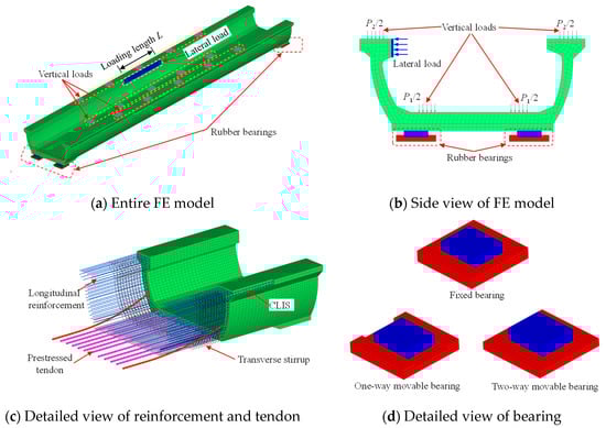 Refined numerical model of U-shaped girder under lateral and vertical loads. (a) Entire FE model; (b) Side view of FE model; (c) Detailed view of reinforcement and tendon; (d) Detailed view of bearing.