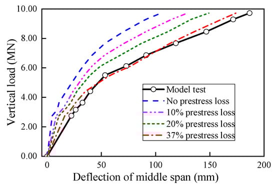 The deflection of U-shaped girder at middle span was taken to validate the accuracy of the numerical model in predicting the ultimate bearing capacity and damage distribution under vertical loading. Firstly, as indicated in Figure 11, the beam deflections at middle span obtained by FE model considering various prestress loss ratios were compared with the test results. It can be observed that the beam deflection from the FE model without prestress loss under the same load was larger than of the vertical deformation from test model obviously, which implied that no considering of the prestress loss in the numerical model was not appropriate. Previous studies also have shown that prestress loss often occupies 20%~40% of the total prestressed force [], and also have significant influence on the critical load of cracks emerging and deformation behavior. In addition, Figure 11 also presents the beam deflection results predicted by FE model with 20% and 40% prestress loss to the controlled tension stress of 1395 MPa. The comparison results indicated that the model considering 37% prestress loss is close to the desired values by the model test, and the actual stress level of the tendons are about 879 MPa consequently.