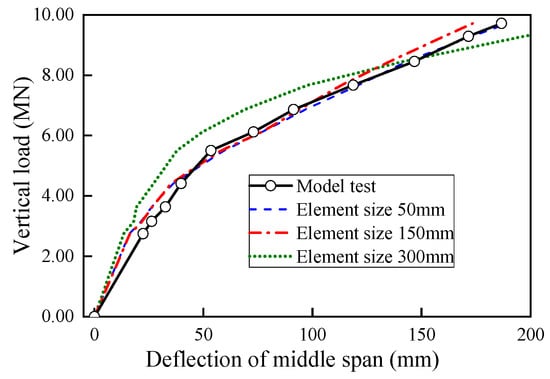Mesh convergence tests were performed to obtained optimal element size for the structure modeling. As the results shown in Figure 12, the prediction values by FE model with 300 mm mesh yielded larger errors compares with 50 mm and 150 mm mesh models. Since using 150 mm mesh sizes can give very accurate numerical results. Further decrease in element size only created a slight closer result to the test result but lead to massive computational cost. Hence, 150 mm mesh size was determined as the rational element size and used to establish the numerical model in this study.