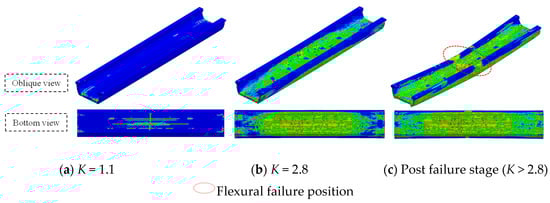 In the full-scale model test, as the girder reached its ultimate load stage, the vertical loads did not continue increasing, and the complete failure phenomenon of U-shaped girder subsequently followed the ultimate loading stage was difficult to be observed. While the employment of FE modeling approach made it possible to investigate the structural performance at the post failure stage. The plastic damage distribution of beam for K = 1.1 and 2.8, as well as the post failure stage (K > 2.8) are shown in Figure 13. At the stage that the beam subjected to 1.1 times design load (K = 1.1), only several local plastic damage emerged at the bottom slab and the areas near bearing support, and most other parts still exhibited linear elastic feature. As the vertical load reached ultimate value (K = 2.8), a wide range of plastic damage occurred at the bottom slab and the both sides of web, while no obvious structural failure happened yet. When the vertical load continued increasing and exceeded the ultimate bearing capacity, plastic damage developed in a short time at the bottom slab and flange and severe flexural failure could be observed at the middle span of beam, Meanwhile, the deflection of U-shaped girder increased rapidly and the structure lost its vertical bearing capacity completely. Compared with the crack development depicted in Figure 13, the numerically-obtained plastic damage areas at K = 1.1 and 2.8 were in good agreement with the crack distribution diagrams by model test, which also demonstrated that the FE model in this study was reasonable.