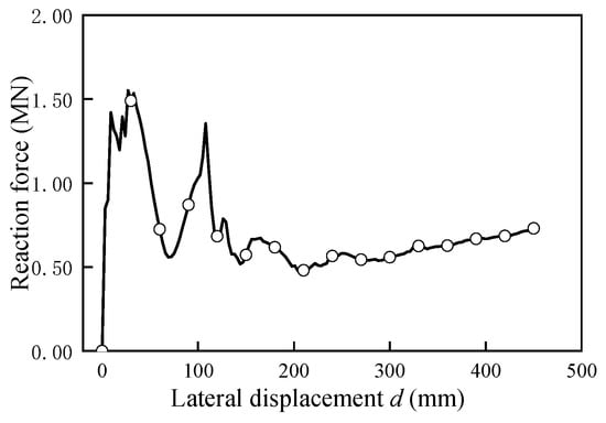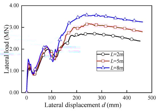 Figure 14 shows the lateral displacement-load curves for three different loading lengths (L = 2 m, 5 m and 8 m, respectively). It can be observed that, for all cases, the loads decreased significantly as the lateral displacements exceeds 300 mm, which implied that the web of U-shaped girder suffered severe damage and its lateral resistance decreased significantly. For this reason, the web damages in all cases were implemented by applying 300 mm lateral displacement at corresponding positions.