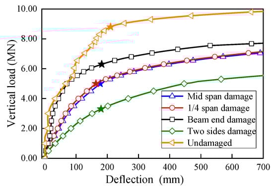 The load-deflection curves of U-shaped girder with various damaged regions are shown in Figure 17, and the comparison results are listed in Table 4. Compared with other damaged areas, in the case of the girder web was damaged at the beam end, the influence on the bearing capacity of the structure was minimal and it caused 30.7% reduction of Pu. Very close load-deflection curves and were yielded by the model of damage at middle span and 1/4 span, and reduction percentage of ultimate bearing capacity for these two cases was about 42.0%~43.2%. In addition, the girders damaged at middle span and 1/4 span also showed smaller vertical deformation stiffness than the beam end damage case, it demonstrated that the web damage around the middle span region would weaken the structural bearing capacity more than beam end damage case. More extreme circumstance that the damage occurred at both sides of web was taken into account in this part. For this case, it was assumed that damage occurred at the middle span of one side and at the beam end of the other opposite side. Since the vertical stiffness was degraded significantly in the two sides damage case and the deflection increased rapidly during the overall loading process, it was difficult to find an obvious turning point to determine the accurate bearing capacity of structure, an approximate point defined on the curve which it had the same deflection as the case that damage at middle span. Obviously, the case damage at both sides yielded the smallest bearing capacity (62.5% decrease in Pu) and deflection stiffness.