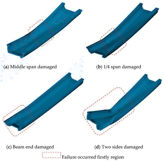 To further interpret the reason of bearing capacity reduction and failure mechanism of U-shaped girder, Figure 19 gives the ultimate structural failure patterns under various damaged regions of U-shaped girder firstly. For the cases that the single side web damaged at middle span and 1/4, the damaged web buckled to the outer side, meanwhile the bottom slab combining with web at the other side undertook the bending moment, and structure failed as overall flexural way finally. With regard to the beam end damaged events, a different failure pattern was observed. That was since the section was not weakened around the segment where bending moment was dominant inner force, as the load increased gradually, overall flexural failure could not happen until local flexural failure occurred at the bottom slab where the bearings were placed. Therefore, the ultimate load in Figure 19c was larger than the other cases in Figure 19. Overall flexural failure came up firstly in the case of both sides’ web damaged. Moreover, since both sides section of girder were weakened more severe than any other cases, smaller ultimate bearing capacity was yielded by this case.